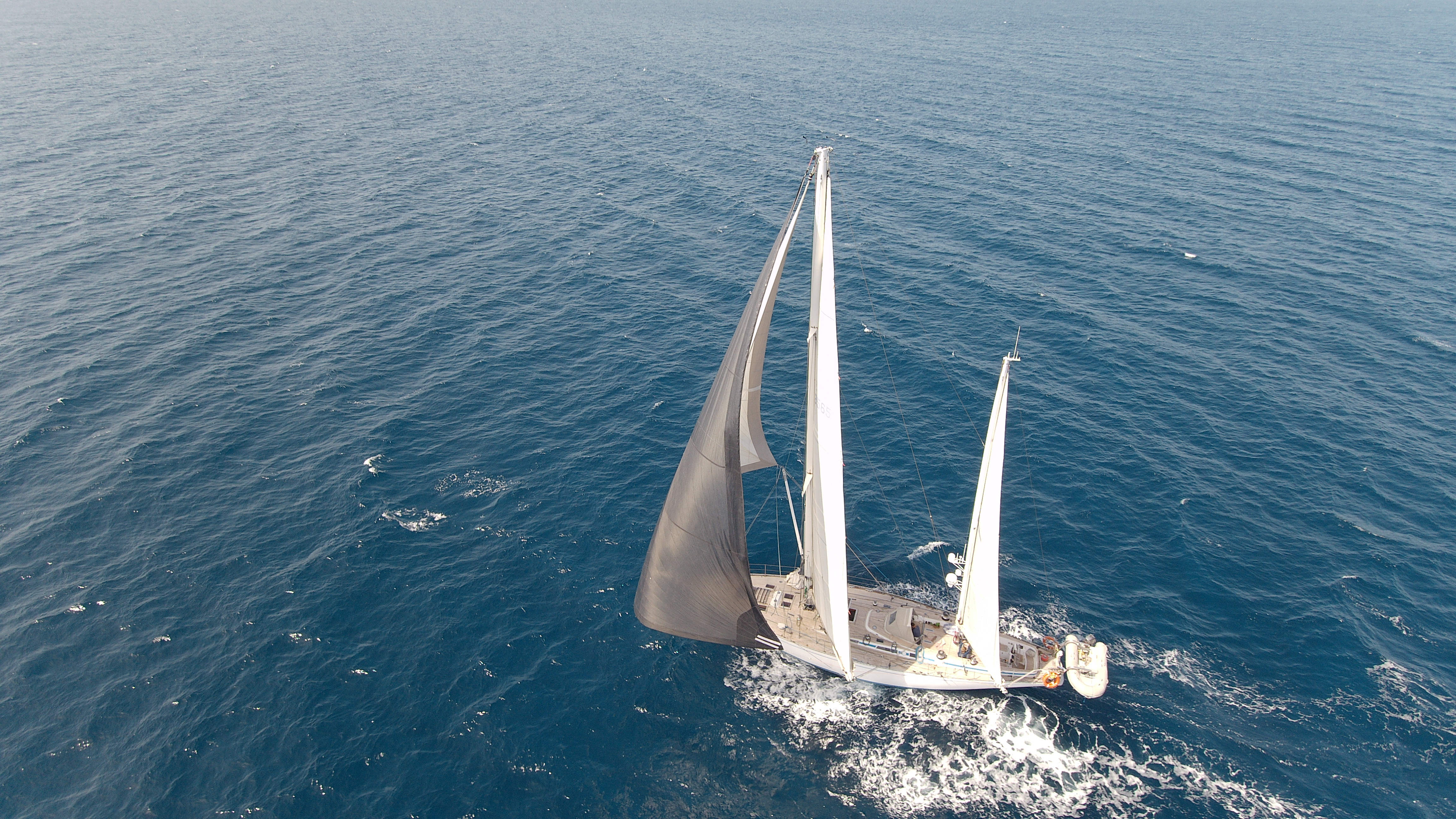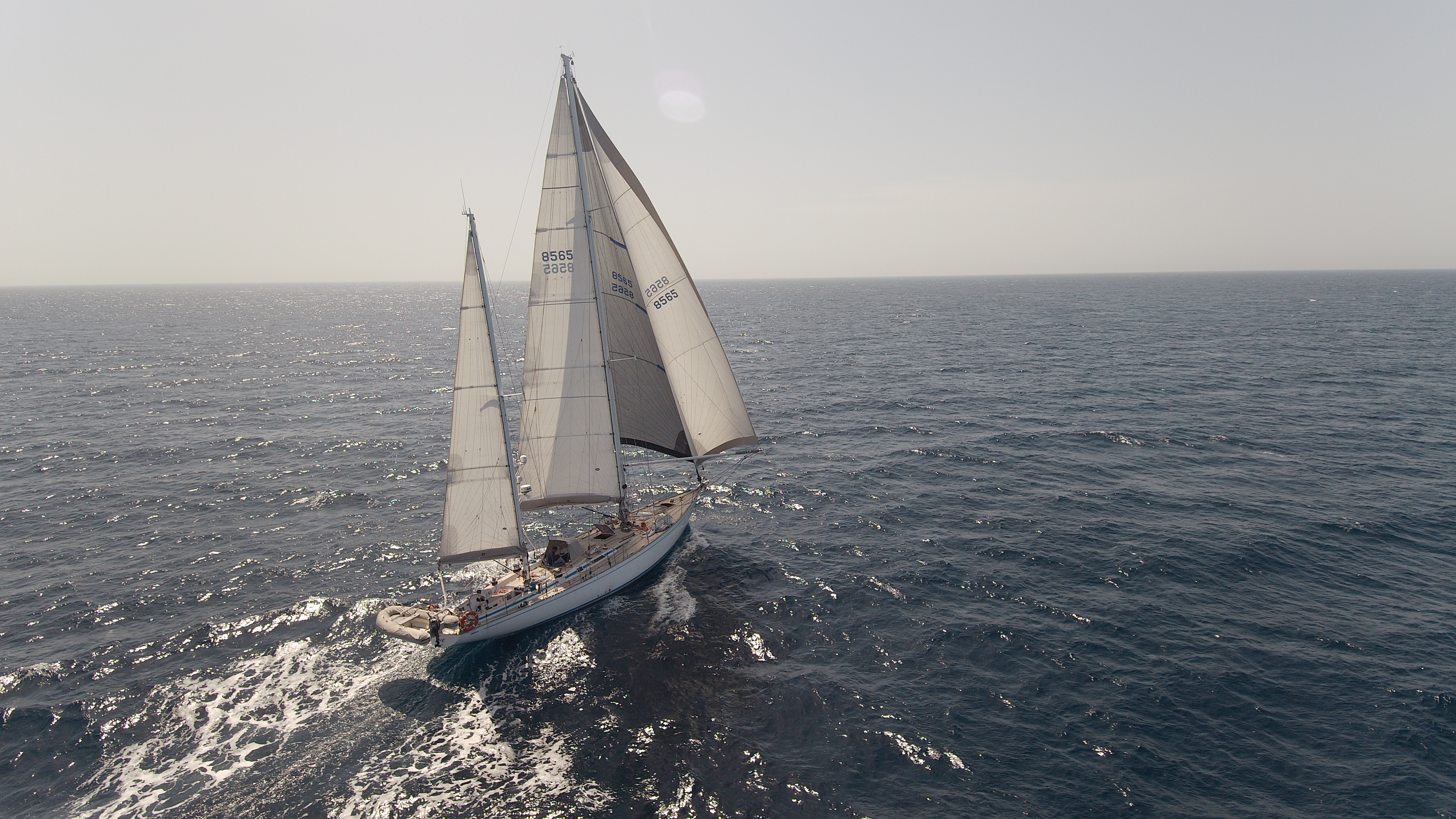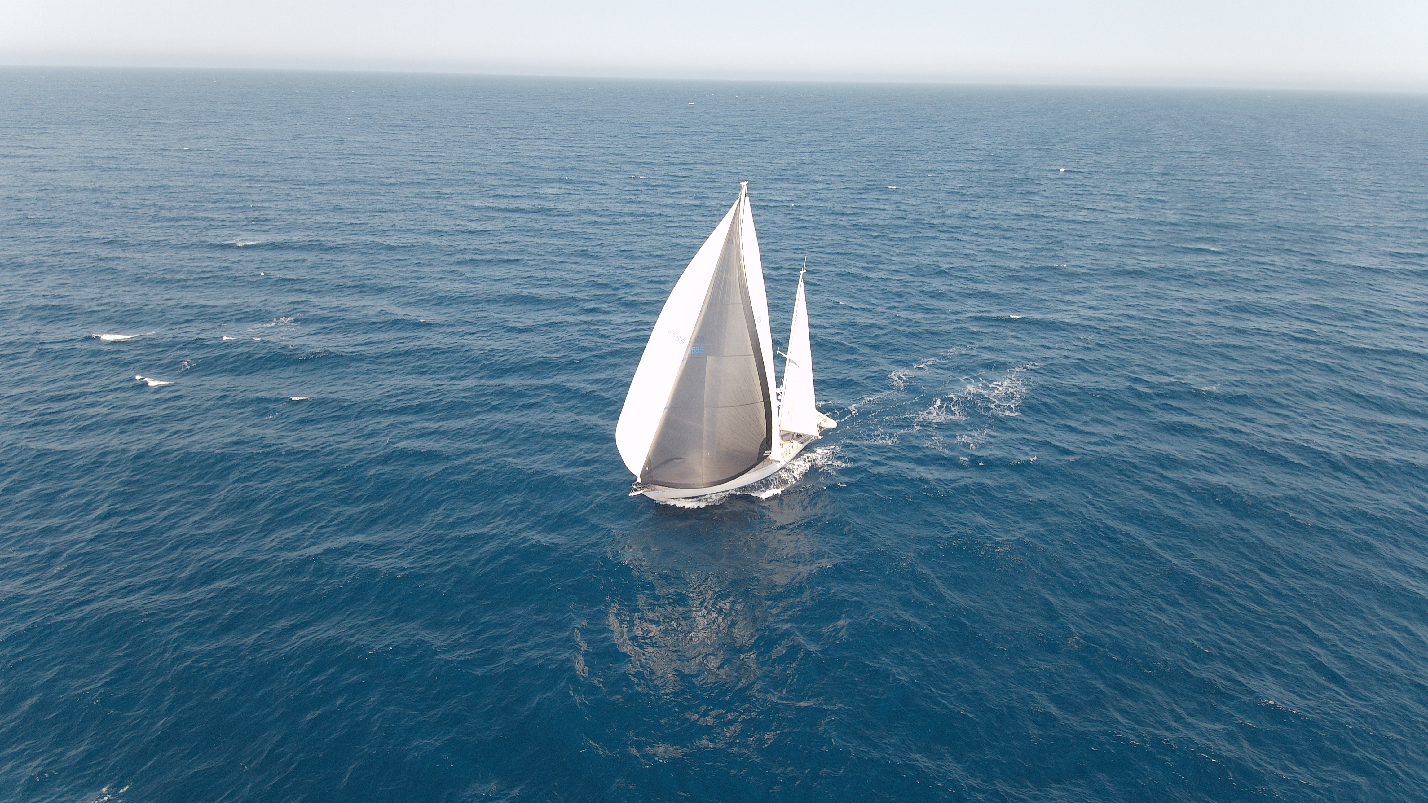 Double handed often means solo on deck , so we got creative with the sail configuration. We found that instead of playing around with spinnakers flying the code zero, using our main boom as an outrigger for the sheet worked really well. Its filled mostly by the deflected wind of the poled out headsail and got us a good speed while sailing low angles. If the wind picked up , only having to furl the zero made it quite safe.