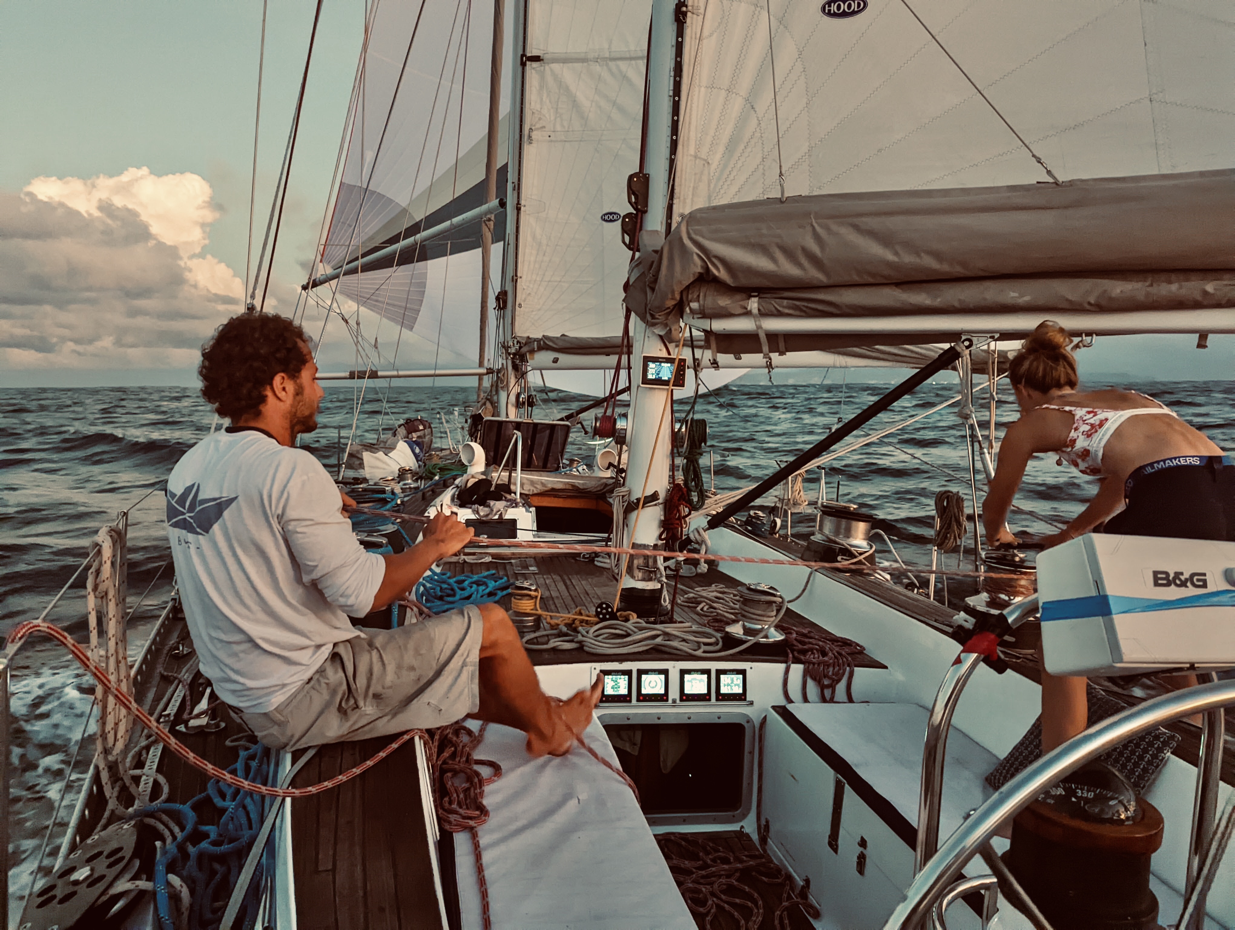 We also notice the second batten from the top of the main was coming out and found out that the batten had gone through the batten pocket ( on the leach side ). With the help of a calm sea state we managed to drop the main and have it fixed before the sun set…A little epoxy mix and a bit of fibreglass didn’t take long to cure in the heat! It was a great feeling to be well prepared for a passage knowing you have all the tools to fix almost anything onboard. Especially when embarking on such a big crossing.